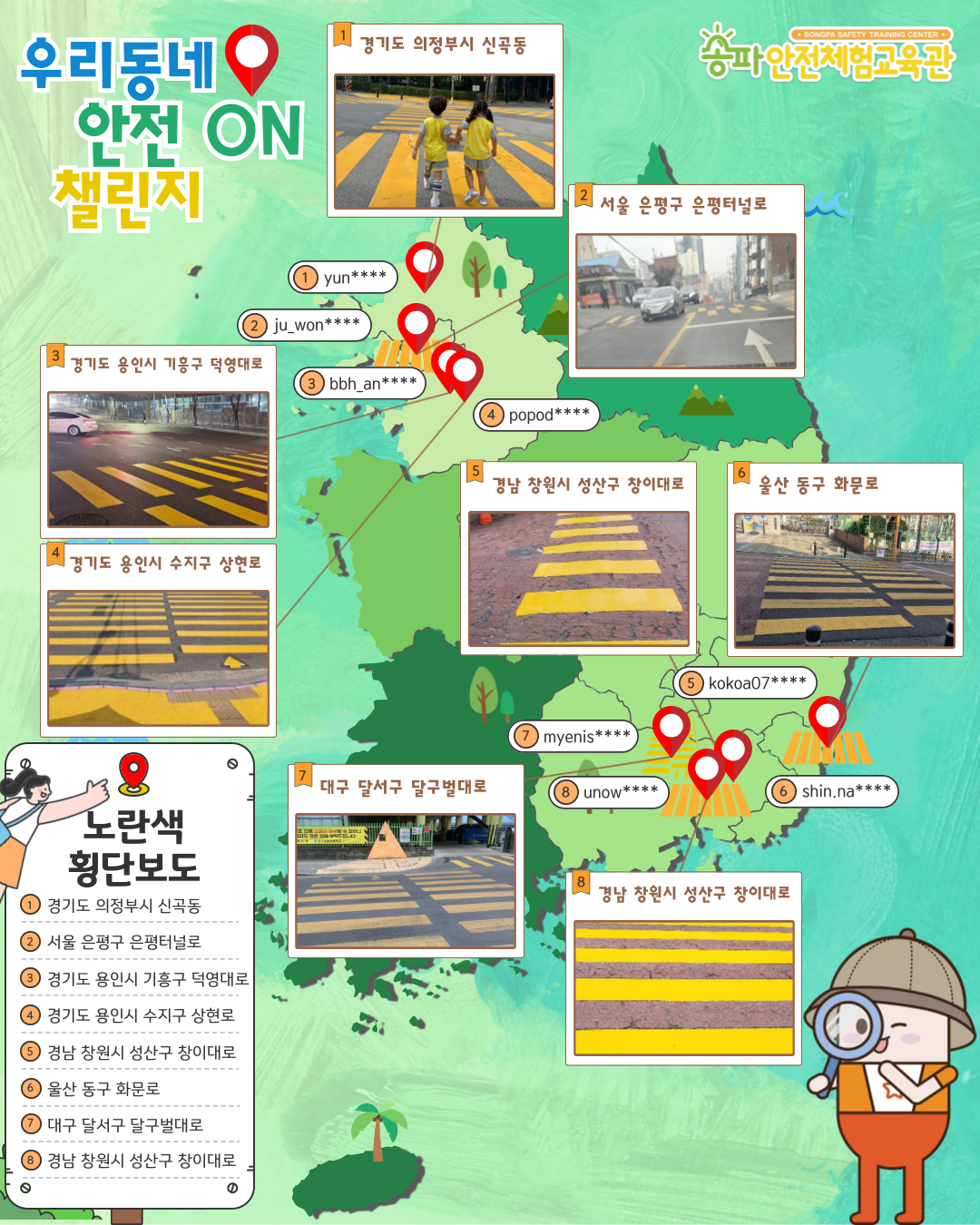 👉 여러분께서 직접 찍어 보내주신 1월 ‘노란색 횡단보도’ 사진 덕분에 자람이의 안전 지도가 완성되었습니다!